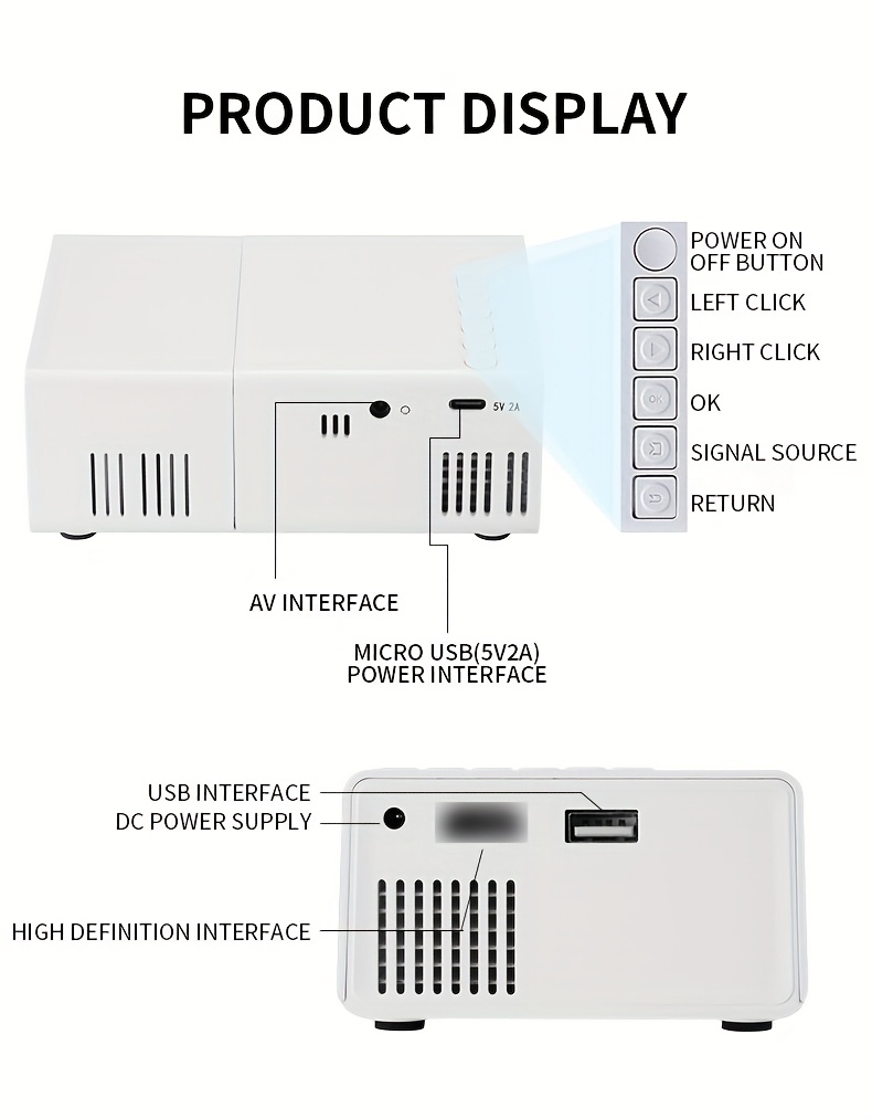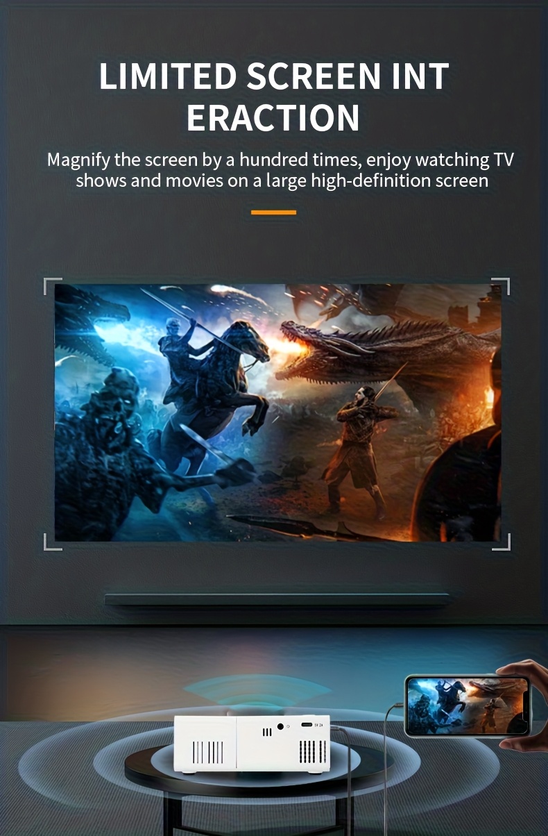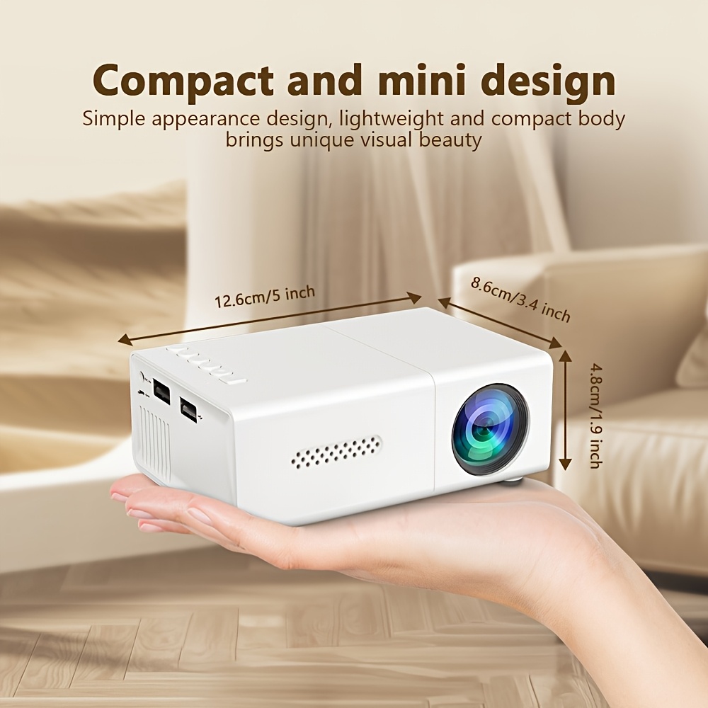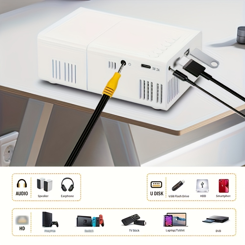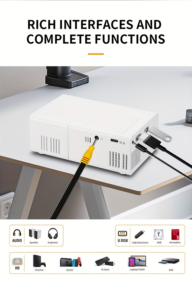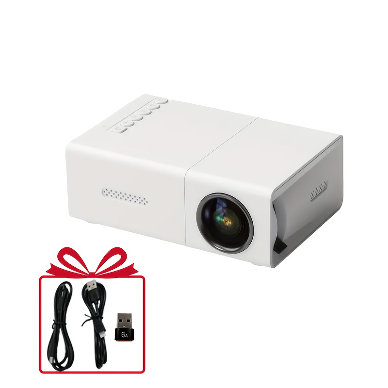 Portable Mini Projector, USB-powered with 320×240 native resolution and 1080P Full HD support. Perfect for home theater, movies, gaming, and presentations. Compatible with smartphones, tablets, and laptops. Plug-and-play design creates a compact, portable mini cinema experience anywhere.