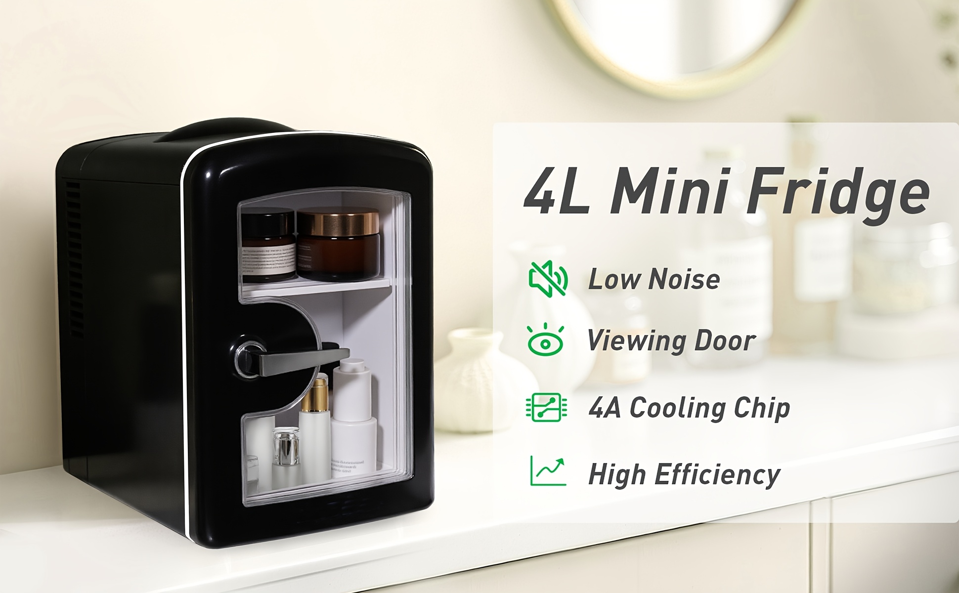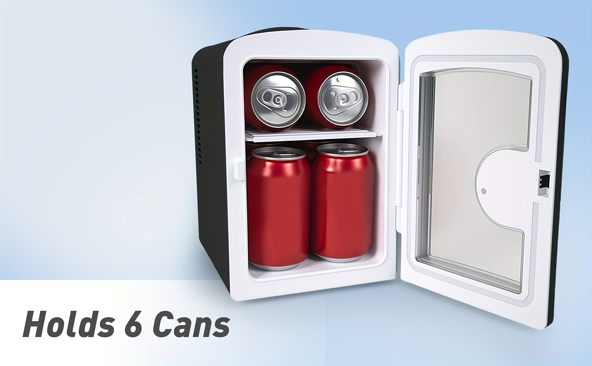 Keep your drinks and snacks perfectly chilled or warm with this 1.06-gallon portable refrigerator. Featuring a mirror and light, it easily holds six 12-ounce cans in a compact, space-saving design. Ideal for cars, bedrooms, offices, and travel, this white mini fridge delivers both heating and cooling, combining convenience, style, and portability for everyday use.