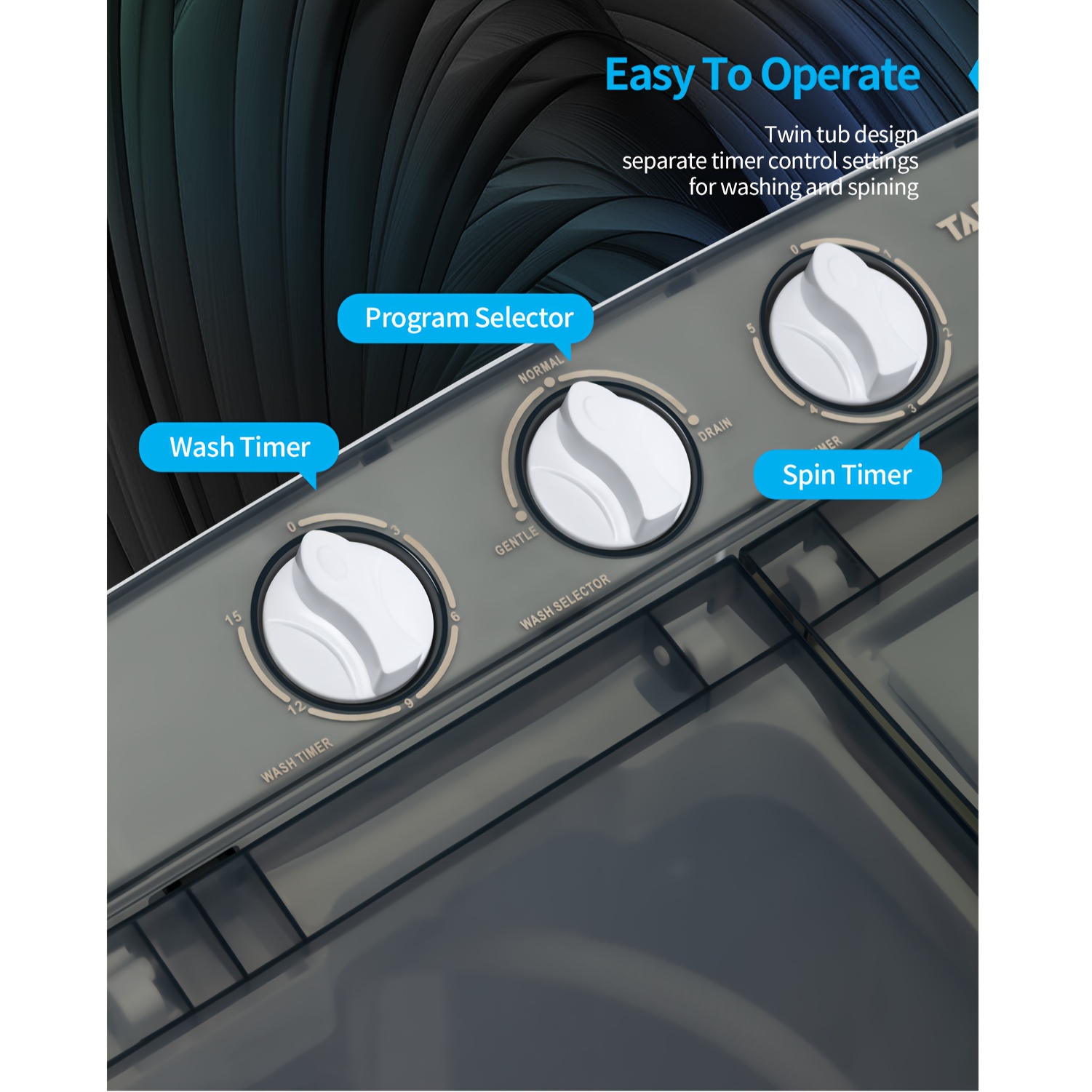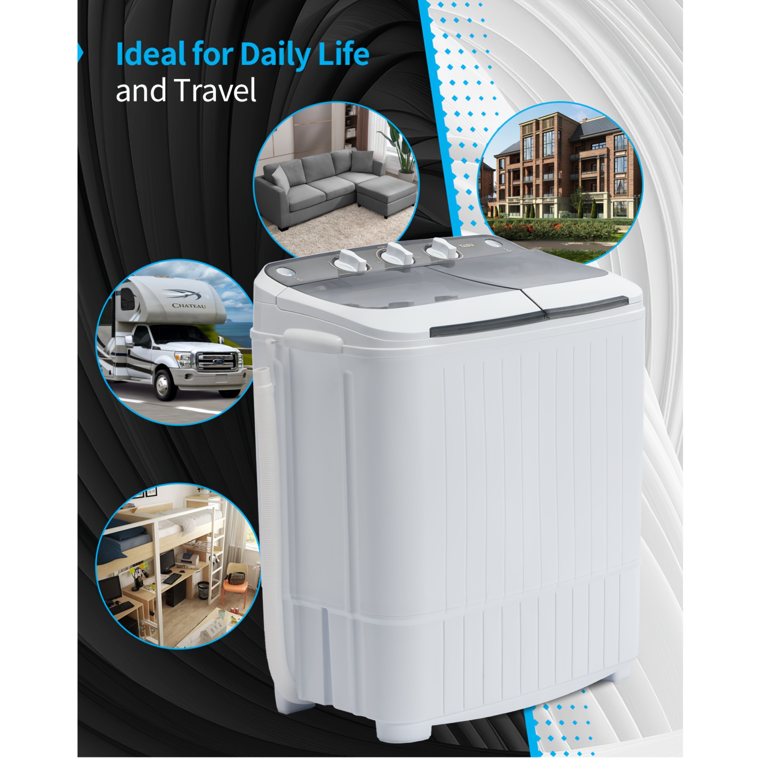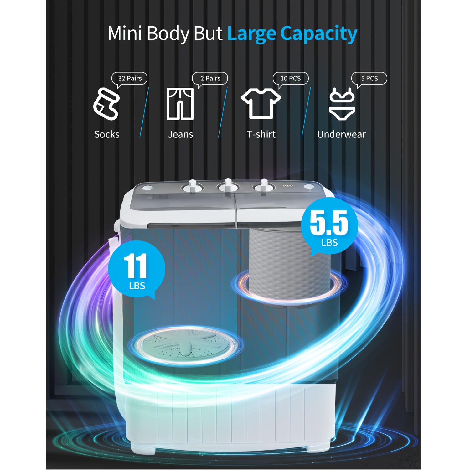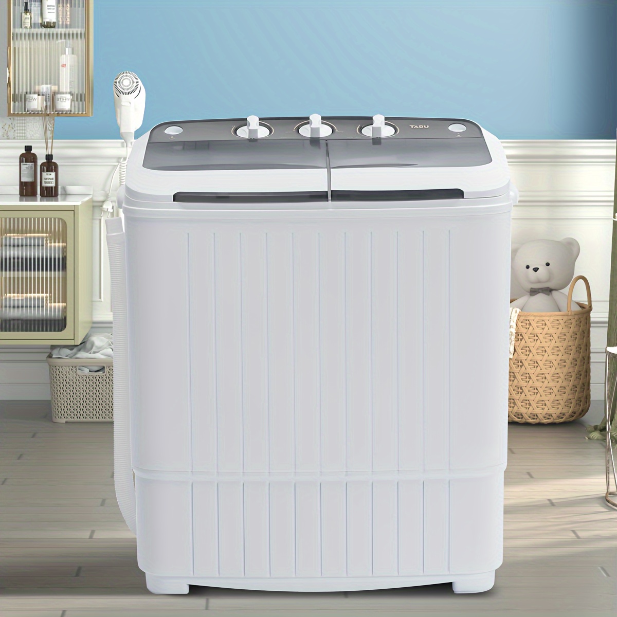 Compact, powerful, and convenient, this Portable Washing Machine features a 16.5lbs capacity with a twin tub wash and spin cycle combo for efficient laundry anywhere. Ideal for apartments, dorms, RVs, and camping, this mini washer and dryer saves space, water, and energy while delivering fast, effective cleaning.
